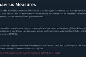 因受新冠病毒疫情影响,位于土耳其的《骑马与砍杀》开发商TaleWorldsEntertainment宣布今日起开启远程办公模式。对于远程办公是否会影响《骑马与砍杀2》游戏发售时间,TaleWorlds