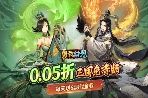 《勇敢幻想》0.05折三国免费版,每天送648代金券。精美的美术风格,酷炫的武将及技能,给你带来不一样的游戏体验。尊享无限真充,闯关送点券,免费直充畅享豪礼。疯狂送1000抽,做任务送红将,连续登录送彩将,三国名将尽入囊中。游戏真实还原三国历史,攻城略地匡扶汉室,主公等你来战!勇敢幻想(0.05折三