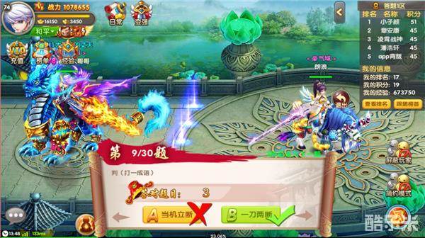 1.玩家进入场景后根据题目和选项所在方向移动自己的位置,题目结算时如果玩家处于正确位置则可获得答对经验奖励并获得积分。