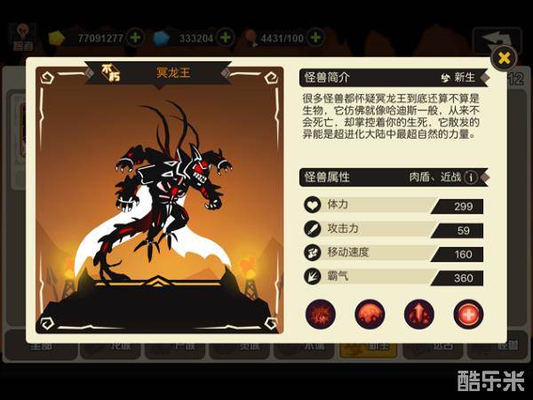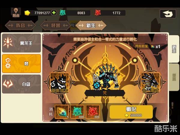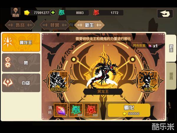 消耗材料:冥龙王新生结晶*1(124关掉落)+300进化孢子+300强化孢子+50W金币
