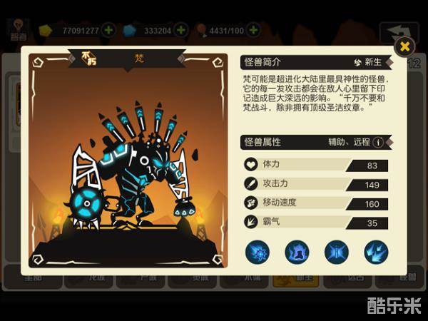 怪兽评价:最全面的控场怪兽,没有之一。如同游戏里怪兽简介里面说的:“千万不要和梵战斗,除非拥有顶级圣洁纹章!”小编在打128关时简直被它折磨得痛不欲生!而且梵的攻速和射程都比较理想,是个很全面的远程单位!