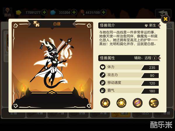 怪兽评价:美貌与实力并存的妹纸,你值得拥有!黑丝、吊带,还有魔性的小尾巴,天啦噜~不愧是新生族的颜值代表!在培养白昼的时候要注意几点:第一,白昼虽是后排,但是仅仅需要防御属性就能打出很高的伤害(原因在于3技能),堆防御属性更能让她持续地在团队中发挥作用;第二,白昼的射程只有400(不知道是不是设计师故意为之),因此为了保证她的安全,基因突破方面记得洗出加射程的属性。