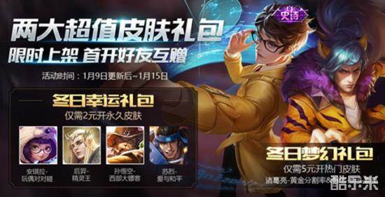 1月9日版本更新后,《王者荣耀》游戏商城将新添一个贴心功能:两款超值皮肤礼包现在可以好友之间相互赠送了!一款皮肤礼包为冬日幸运礼包:玩家有机会获得永久皮肤、钻石、皮肤碎片、新品英雄抽奖券中的任意一种。另外一款为冬日梦幻礼包:玩家有机会获得诸葛亮-黄金分割率永久皮肤、韩信-街头霸王永久皮肤、钻石、皮肤碎片、英雄碎片、积分夺宝抵用券中的任意一种。
