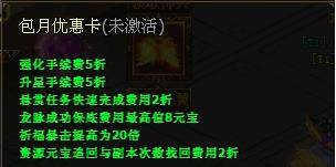 包月优惠卡,这是游戏中一个非常有意思的玩法,我们在游戏中可以激活包月优惠卡,钱不多,但是对于我们的成长其实是非常有帮助的,我们在游戏中的很多玩法都可以节省大量的花销,比如,强化手续费5折、升星手续费5折,悬赏任务快速完成费用2折、龙脉成功保底费用最高值8元宝、祈福暴击提高20倍、资源元宝追回和副本次数找回费用2折,这些可以帮助我们节省的开销是非常大的,月卡的价格只有88元宝,玩家朋友一包烟的价钱,使用的时间是31天,大家可以购买。其实在游戏后期这个样的包月优惠卡其实必须要使用的,前期可能作用并不是特别大,所以玩家朋友在游戏中想起这样的玩法的时候如果经济充裕是对我们提升帮助非常大的。