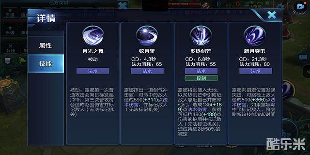 技能解析:第一次攻击露娜都会位移一小段,可以穿越墙体也可以利用小兵接近敌人;一技能标记范围非常大,在露娜背后也可以被标记到,最好能用该技打中多个目标;二技能能控制敌人,也可以把隔墙的敌人拉过来;三技能能对一条路径上的造成伤害。