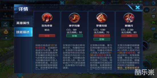 玄策舞动钩镰,在技能舞动期间增加自身移速且增加技能释放距离,蓄力后向指定方向甩出,对路径上的敌人造成伤害并钩中最后一个敌方单位,,这点很重要,如果敌方英雄身后有小兵时,如果二技能钩子太长时,只会够中小兵而不会命中敌方英雄.在钩中英雄时触发狩猎效果,增加自身的输出伤害并且减少敌方对自己的伤害.再次释放此技能会将敌人甩向身后,同时失去狩猎效果.通常是利用二技能钩中敌人,然后利用一技能拉近距离,使用二技能第二段将敌方甩向己方,集火击杀.