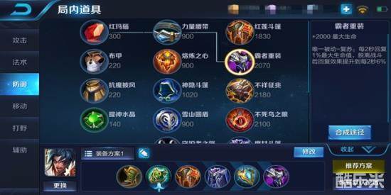 解析:影忍之足在前期为项羽提供小幅物理防御,并减少15%的普通攻击伤害,这件装备在对面有阿轲,孙悟空类英雄时更加有效,如果对面法术伤害英雄较多或控制较多时,可以考虑换为抵抗之靴。救赎之翼是辅助装备,也是一件工资装,可以在项羽经济是我方最低时,为其持续提供经济或经验,并且其主动技能可以给周围血量最低的队友加盾加移速,保人专用。