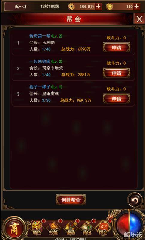 帮会管理:管理大厅可以查看帮会基础信息、成员列表、帮会公告等,可以对帮会进行建筑升级、成员管理,还可以查看帮会排行榜。
