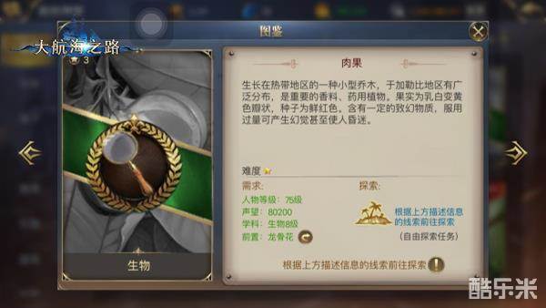 里斯本读书(5条线索),要求人物75级,冒险声望80200,生物8级,前置发现物“龙骨花”。