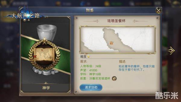 24个碎片合成,要求人物74级,冒险声望41000,神学15级,前置发现物“浮雕双耳银酒杯”。