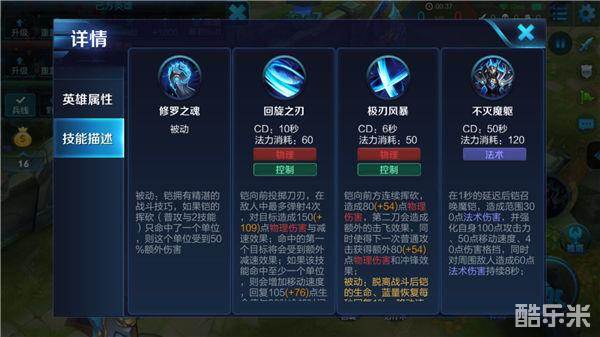 被动-修罗之魂:若铠的普攻或二技能只命中了一个单位,则目标将受到额外的物理伤害。