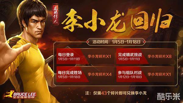 随着新英雄温蒂的登场,这位英魂小萝莉也带着她的全新皮肤“甜蜜之锤”正式亮相,玩家们在1月12日至1月18日活动期间,使用新英雄温蒂参与匹配并获取胜利,就可以领取专属宝石奖励!而拥有温蒂英雄或“甜蜜之锤”皮肤的玩家,将这份甜蜜分享给好友们,也可获得对应宝石奖励! 海量福利中不光有甜蜜萝莉带来的惊喜,英魂最会打的男人“李小龙”活动也在火热进行中,参与游戏获得李小龙碎片,集齐后即可兑换永久英雄李小龙等海量奖励。