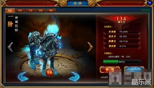 坐骑装备:坐骑可穿戴装备。坐骑装备为坐骑属性提供百分比加成。玩家使用道具可提升坐骑装备等级,等级越高,加成百分比越明显。