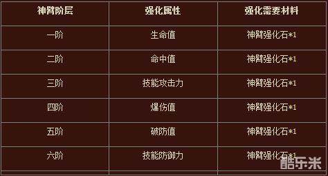 神臂每进阶一级,可以开启一项强化属性,通过消耗神臂强化石头进行强化属性,强化等级上限为人物等级的三倍,阶层对应强化属性如下表: