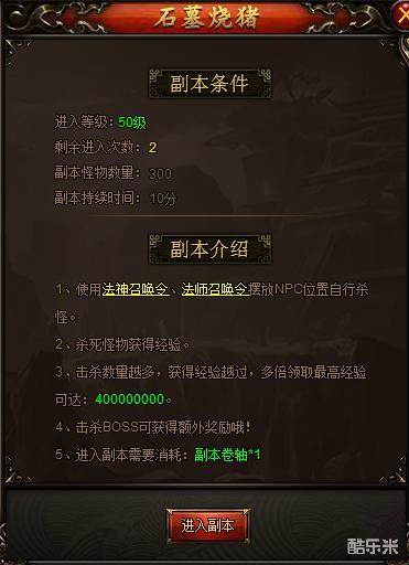 你以为这样就能毫无顾忌地进去挑战了么?那就太草率了,在我们以前的任务、活动、boss等等挑战的时候,都有机会获得一个道具叫做“法师召唤令”以及“法神召唤令”,这是我们石墓烧猪的必备消耗道具,他直接决定着我们最后能获得多少经验奖励。