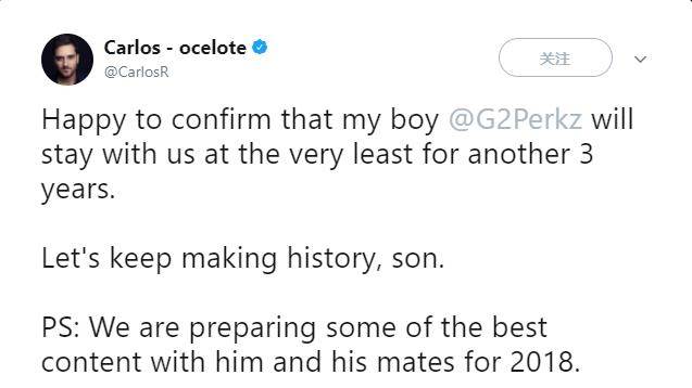 Ocelote在推特中写道:很开心向大家宣布,我们的Perkz将会在未来三年内留在队中,让我们一起创造历史吧