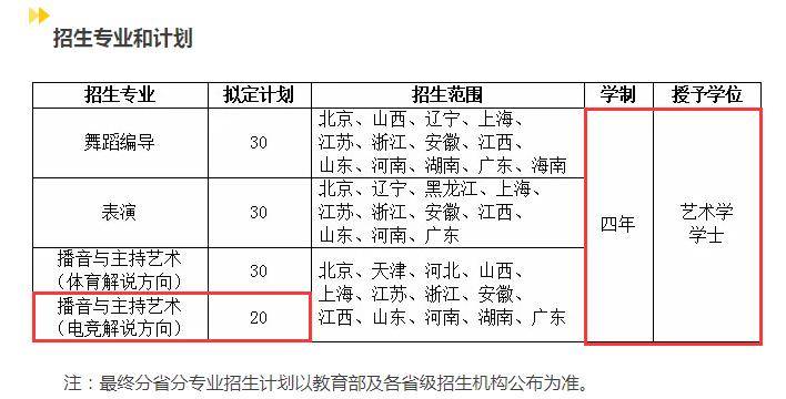 上海体育学院招生办昨日发布的招生专业和计划中,包含了播音与主持艺术(电竞解说方向),四年学制授予艺术学学士学位: