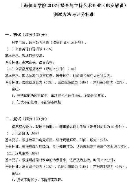 该校招生办随后还公布了播音与主持艺术(电竞解说方向)测试方法与评分标准,可以看出这个专业的要求比较严格: