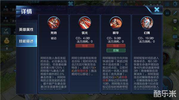 被动-死吻:阿轲在敌人身后发起的攻击,必定暴击(包括技能),但是基础的暴击伤害较低(阿轲的暴击伤害会随着暴击几率的增加而提高)。阿轲所有的正面攻击,都不能产生暴击效果。