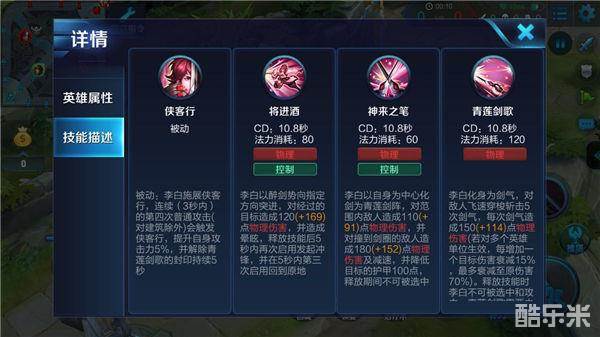 三技能-青莲剑歌:李白化身剑气,对范围内敌人攻击五次,造成多段物理伤害。如果敌方多名英雄单位受到该技能伤害,则每增加一名英雄,伤害将有所衰减。释放剑气期间李白不可被选定,且使用完毕之后该技能立即进入限制状态。