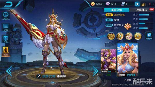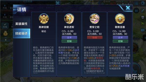 雅典娜是唯一一名不用在泉水复活的英雄,并且拥有位移、减速、控制、护盾等多项优秀能力,是一名非常强势的战士英雄。