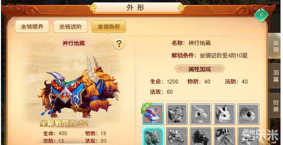 通过消耗道具进阶坐骑等级,每次进阶一个等级都会解锁新的外观。