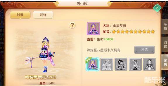 根据角色 性别展示该系列的角色外观,内置淬炼功能,提升外观附加属性并且获得永久使用权。