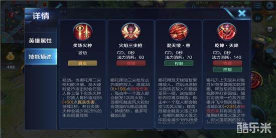 解析:输出技能。哪吒普攻或者技能命中敌人时会在敌人身上留下持续3秒的火种,每秒造成一定的真实伤害和降低敌人25%的生命回复效果。新的普攻或技能命中后都会刷新持续时间。该被动的持续真实伤害对敌方脆皮和残血英雄将造成不俗的伤害。限制生命回复效果对如蔡文姬、扁鹊、貂蝉、程咬金和刘备等依靠回复能力持续作战的英雄可以起到一定的克制。