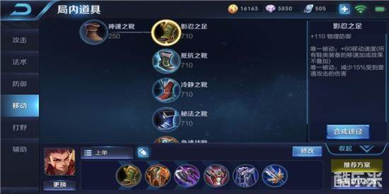影忍之足:鞋类装备。增加哪吒移速,被动提供的15%普攻抵挡可以提高哪吒在面对敌方物理输出时的生存能力。