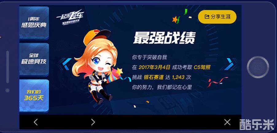 在你和《一起来飞车》共同走过的一年时光里,游戏里的每一个角落都曾经留下你的身影,甚至每一条赛道都曾有你的印记。在《一起来飞车》一周年生日之际,官方首次推出飞车生涯记录,每个人都有属于自己的漂移之旅数据,这里不光有你和飞车相遇的日子,甚至你一共获得多少赛车,挑战了多少次赛道,总长度共多少公里全都一目了然,成为你专属的回忆录!分享后更可获得钻石奖励、赛车碎片等等惊喜游戏道具!