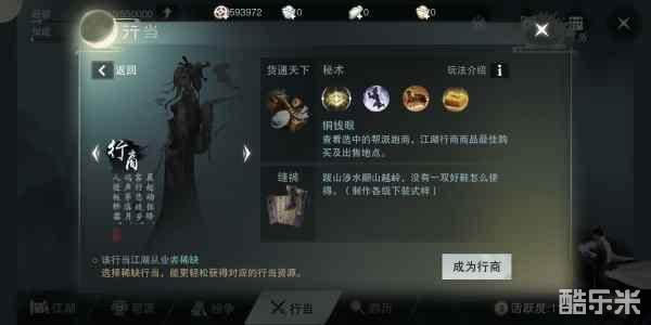 当少侠在游戏中达到行当玩法开启后选择成为行商,会获得对应的行商秘技和制作下装图纸的绝活。行当等级提升可以增加任务完成时提交的商票数。