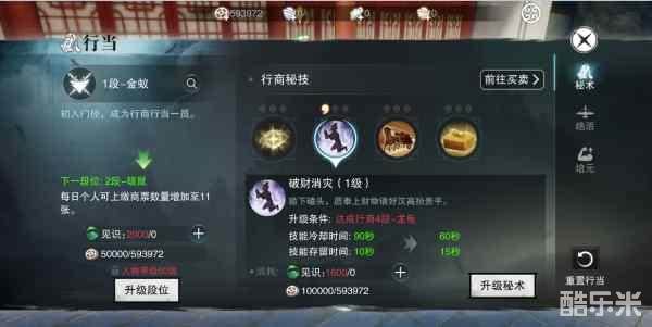 破财消灾:跪下磕头,愿奉上财物请好汉高抬贵手,这个技能可在江湖行商中遇到打劫时使用;技能等级提升可以增加延续时间和缩短冷却。