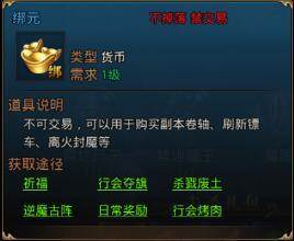 绑元作为《龙腾传世》里价值介于元宝和绑金之间的货币,仍然可以通过在登陆游戏、完成活动来获取。绑金一般用于升级和合成等一些基础操作,绑元则可以用于在商城购买药品、随机石、召唤令等等。但是绑元不像绑金那样可大量获得,如果不是土豪那还是要掂量掂量手头上的绑元怎样用最划算啦。