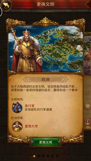 欧洲文明的文明特色是科技-急行军,加快部队的行军速度。代表欧洲文明的名将有查理大帝、亚瑟王等。