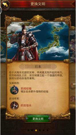 日本文明的文明特色是科技-实战经验,增加击杀野怪的经验。代表日本文明的名将有织田信长、宫本武藏等。