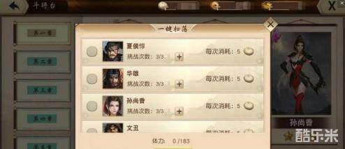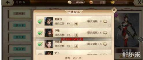 后来知道可以在这获得武将碎片,小编横扫千军一下子扫到了第六章,从最开始的耗时十几秒几十秒到后来的消耗全部的时间也没用挑战过,小编泪牛满面呀,真是小看了斗将台的武将们。但是值得庆贺的是斗将台竟然有一键扫荡的功能,消耗体力值,每次消耗5点体力一个武将。每日挑战次数是三次也就是消耗15体力可以获取对应的武将碎片哦,当然具体获取碎片数量是随机的哦。
