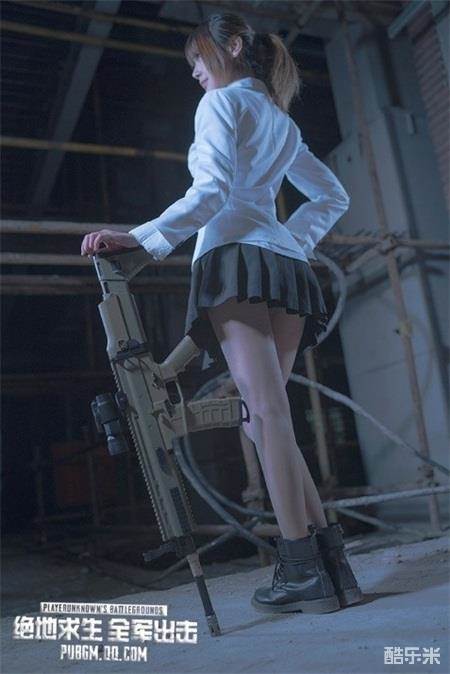 相较于上一幅中明亮的环境,这次的环境更能体现出《绝地求生 全军出击》战场的无情与冷酷,Coser小姐姐也在场景的烘托中也显得更为冷峻。她穿上了在游戏中颇有辨识度的白衬衫和十分稀有的黑色小裙子,手持一把以稳定性著称的步枪Scar。步枪上已经装备了二倍瞄准镜和枪口补偿器,不知小姐姐四处张望,是不是在寻找垂直握把呢?