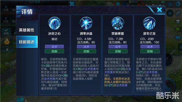 被动-冰封之心:王昭君在脱战后会获得一个可吸收伤害的寒冰护盾,护盾破裂时会对周围敌人造成法术伤害与减速,但被动触发有一定的CD。该技能大大提高了王昭君的生存能力,同时使她的控制手段变得多样化。