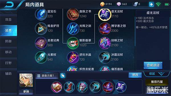 六神装:噬神之书、冷静之靴、痛苦面具、冰霜法杖、博学者之怒、虚无法杖
