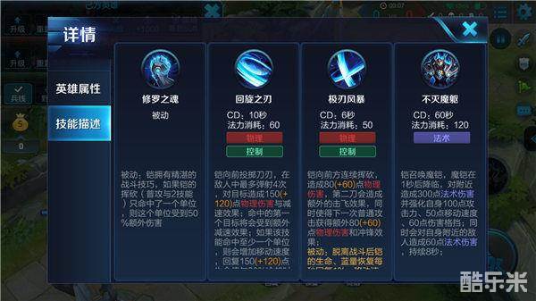 被动-修罗之魂:铠的被动修罗之魂使得他的单杀能力特别强横,二技能与普攻只命中一个单位就会造成额外大量伤害,这就使得逆风单带的铠可以完美牵制对面至少两人让队友去发育。