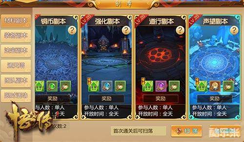 材料副本是《悟空传》中基本材料产出的重要地方,如经验副本、铜币副本、强化副本、道行副本和声望副本。以上这些单人材料副本,全天开放,每天可以免费挑战2次,首次通关后可以使用扫荡券快速通关。
