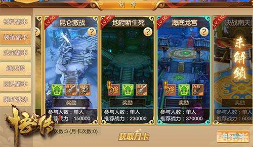 《 悟空传》的装备副本每天可以挑战三次,有等级限制。不同等级的副本产出的装备品阶不一样,等级越高可解锁更高的副本。每一个等级的副本都有推荐战力,玩家根据实际情况量力而行。此外,该副本获取月卡会增加挑战次数。
