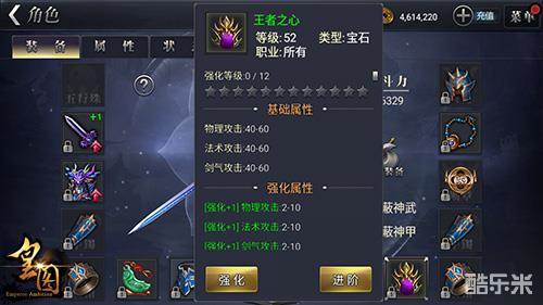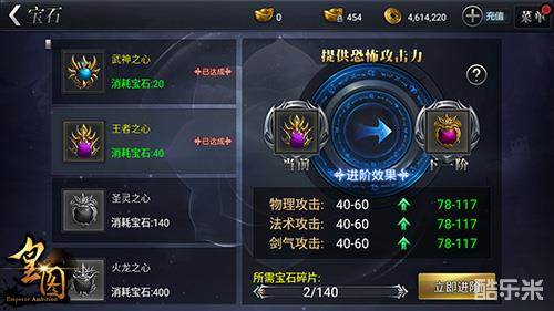 宝石的等阶越高,所带来的属性加成以及战力提升越多。在《皇图》当中,勇士们在宝石系统开启的同时便可以获得初阶宝石“武神之心”。通过消耗宝石碎片,勇士们可以对身上的宝石进行升阶,而宝石碎片可以通过商店购买、充值奖励、挖宝积分兑换、挑战副本等多种途径获得。