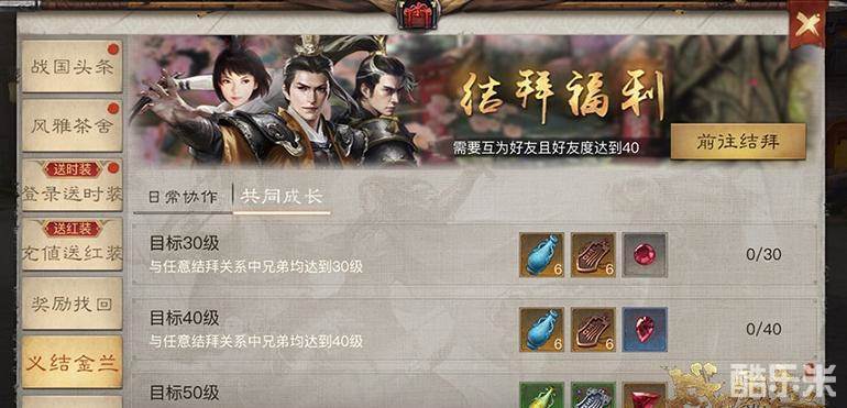 在游戏中,各位将军在达到26级后便可与好友一同前往柳下村“季友伯”处对话,开启义结金兰。结拜需要发起组队,且队伍人数为3~5人,另外,参与结拜的各位将军必须互为好友,同时彼此间的好友度大于等于40。因为每位将军最多可同时拥有三个结拜关系,所以千万记得把珍贵的位置留给生死与共的最好兄弟!