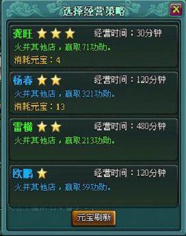 黑店掠夺的刷新规则是上面一排三个刷的是战力大于等于角色本身的,下面一排刷的战力是小于生育角色本身的。都是以当前角色的战力为参考的。相对来说,上面一排如果战胜的话收获要大于下面一排的收获。所以就尽量让上面一排的战力值刷出小的。方法就是留2,3个将在阵上,这样角色的战力就要小得多,结果相对会刷出好的东西。