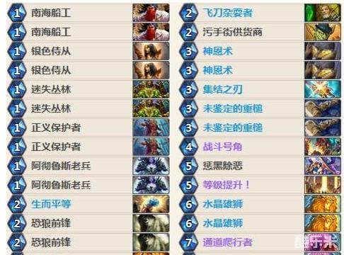 我们起手找银色侍从、正义保护者、恐狼先锋、飞刀杂耍者,迷失丛林可以和飞刀一起留。在对上快攻卡组可以留狂野炎术师;对上控场卡组时则可以留神恩术、通道爬行者。这套卡组的前期铺场能力很强,再配合恐狼或者污手以及未鉴定的重槌的buff,能给对手很大的压力。