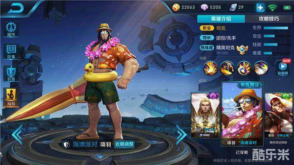 最后编辑于7年前霸王项羽,随着版本的更替以及各式各样的新英雄的登场,一些老牌坦克英雄已经逐渐的淡出了召唤师的视线,项羽也是其中之一。但这并不代表曾经的老牌坦克英雄不再强势,相反,无论是防御能力,抗伤能力亦或是控制能力,项羽在所有的坦克英雄中都是数一数二的,对于局面的适应性极强,时常可以在赛场中看见项羽力挽狂澜的身影。且项羽自身在游戏中是没有任何的疲软期的,项羽只会随着游戏时间的推移,自身装备的成型而不断变强,为己方的胜利打下坚实的基础。下面便进入项羽的教学时间。