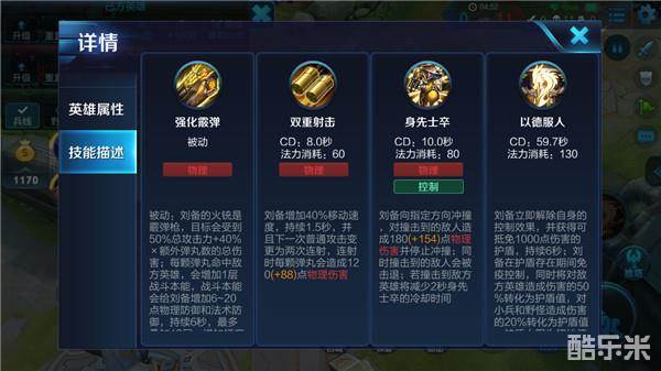 一技能-双重射击:一技能开启后可以短暂提升刘备的移动速度,增强刘备的游走能力,进可攻退可守。同时两次连射大幅度增强了刘备的输出能力,中后期打击脆皮英雄直接对其造成大量的消耗。