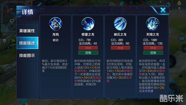 大招让赵云拥有了强力的开团手段,他不仅可以对目标区域的敌人造成击飞效果及物理伤害,而且还能标记敌人为感电目标,在接下来的一段时间内,赵云的普攻及技能将对感电目标造成额外伤害。玩家可以利用此技能强突敌方后排,与一技能配合能够实现超远距离的追击或者逃生。一旦技能命中关键目标,那么赵云会对感电敌人进行高额的输出,敌方后排的生命安全将受到极大程度的威胁。
