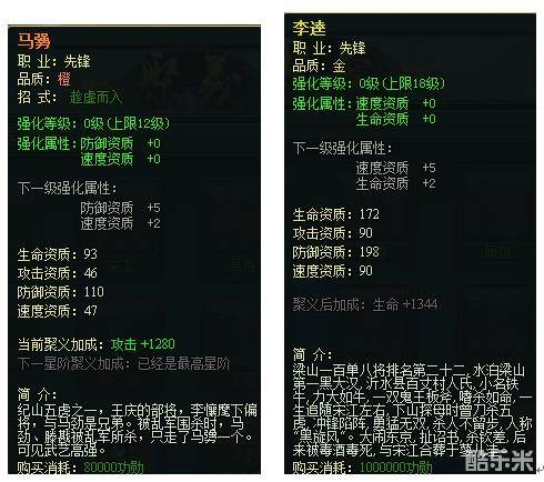 我们可以先来看看金色的将,李逵是第十章的金色,资质上要比橙色和红色完全高一个档次,因为石头太难弄了,所以很难去聚义,因此我们主要介绍橙色和红色。